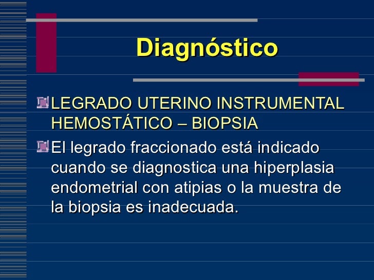 Bx dirigida por histeroscopia (es más sensible que bx por legrado fraccionado) legrad. Este procedimiento se lleva a cabo para extraer el tejido tras un sangrado irregular durante el periodo, un aborto espontáneo o para analizar el.